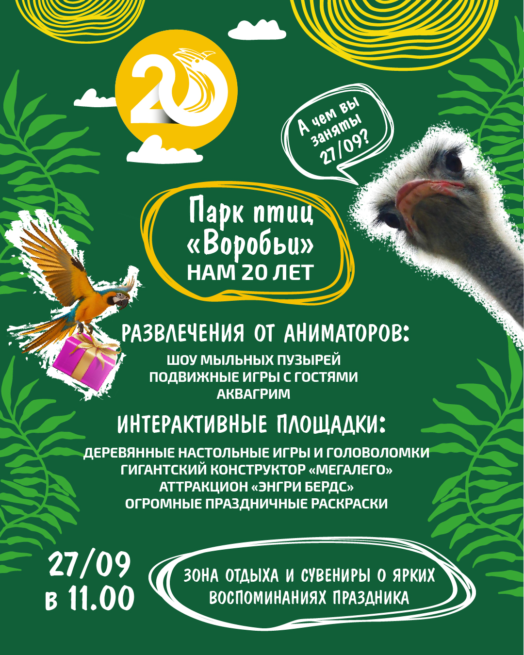 27 сентября парк птиц «Воробьи» распахнёт свои двери, чтобы отпраздновать 20-ый день рождения, и мы с огромной радостью приглашаем вас стать частью этого события - совершенно бесплатно! Погружение в атмосферу праздника уже включено в стоимость вашего отдыха.